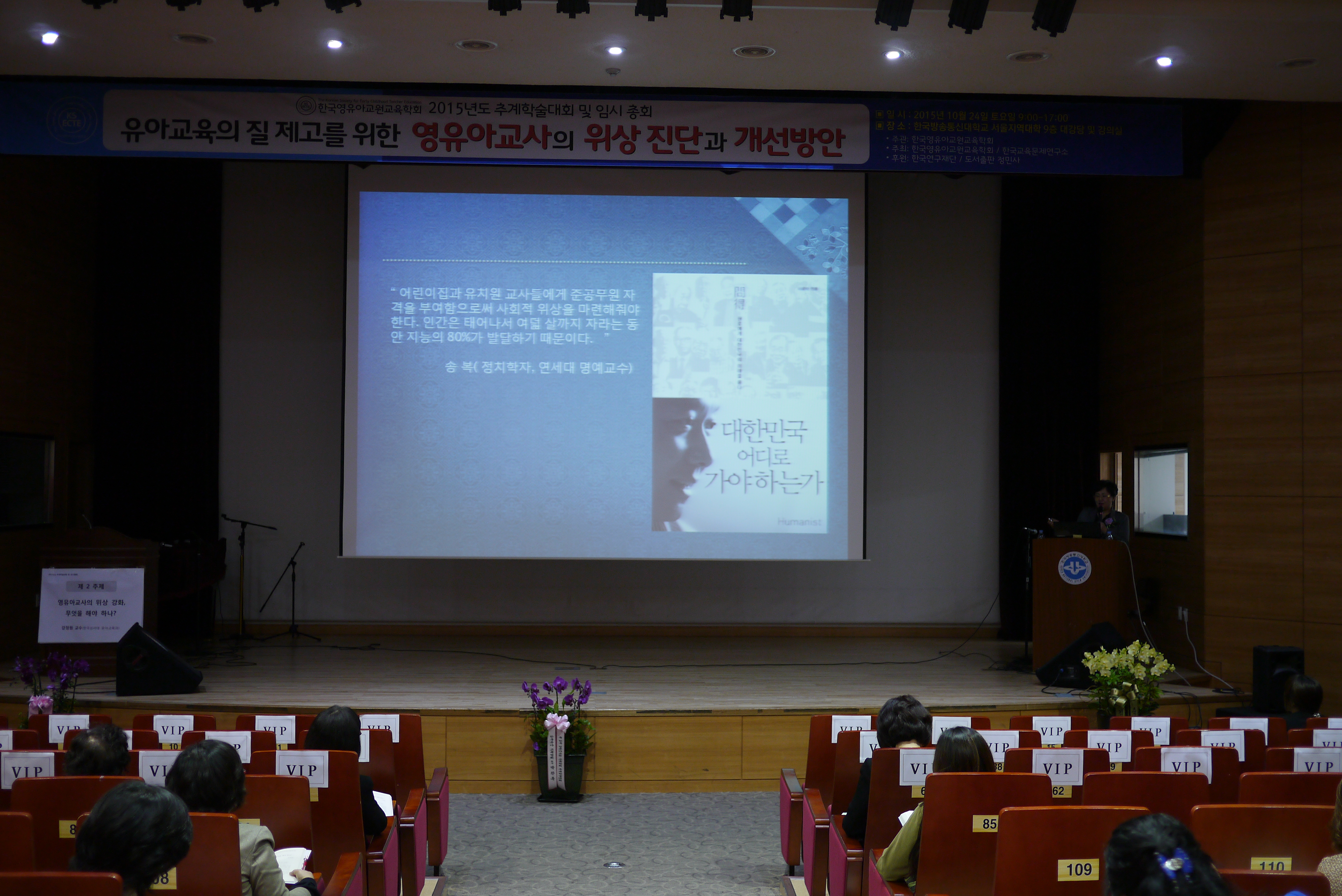 대주제: 유아교육의 질 제고를 위한 영유아교사의 위상 진단과 개선방안 - 일 시: 2015년 10월 24일 토요일 9:00-17:00 - 장 소: 한국방송통신대학교 서울지역대학 9층 대강당 및 강의실 - 주 관: 한국영유아교원교육학회 - 주 최: 한국영유아교원교육학회 · 한국교육문제연구소환영사 ---사진설명------ 주제강연 2 : 영유아교사의 위상 강화, 무엇을 해야 하나? 강정원 교수(한국성서대학교 영유아보육과)