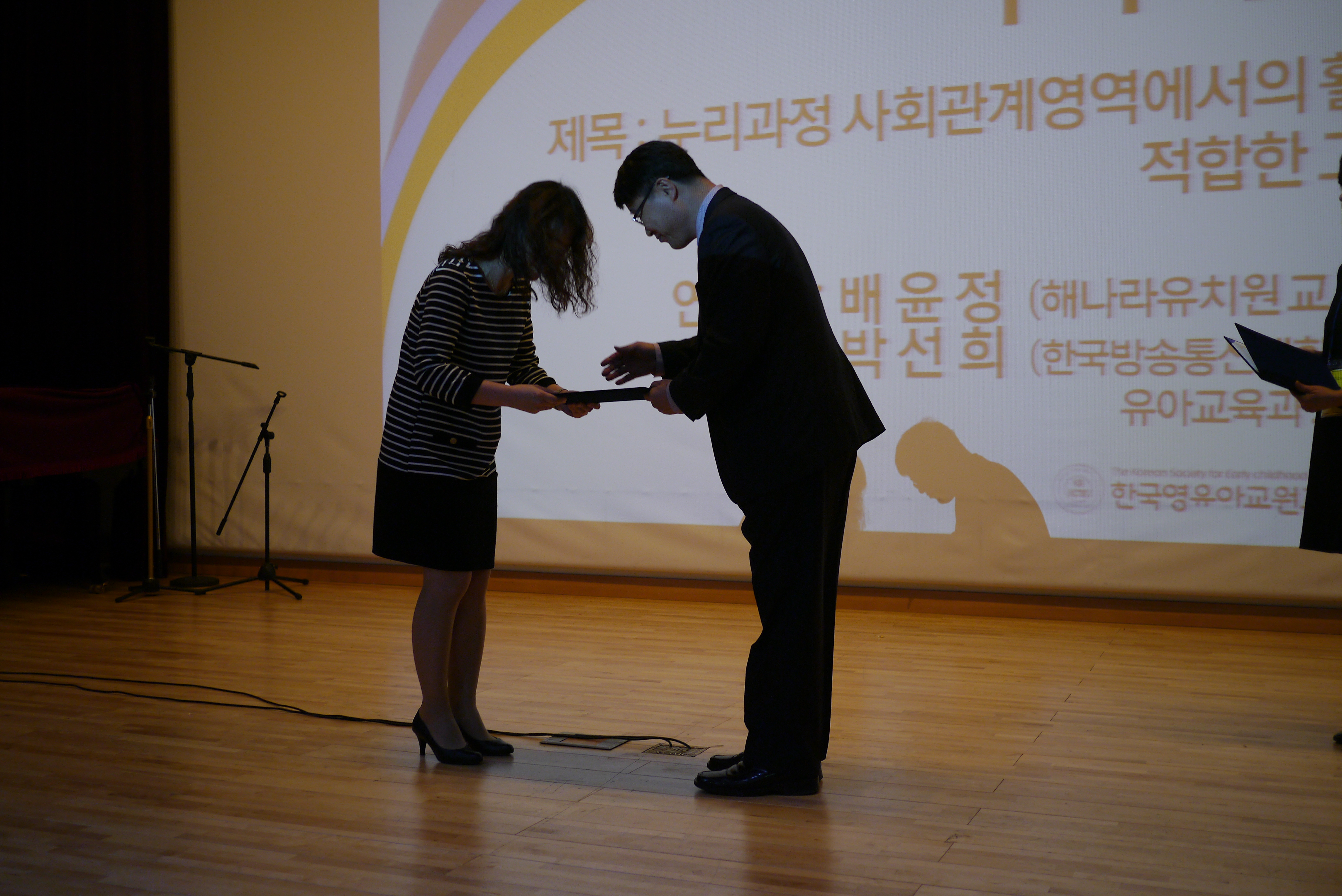 대주제: 유아교육의 질 제고를 위한 영유아교사의 위상 진단과 개선방안 - 일 시: 2015년 10월 24일 토요일 9:00-17:00 - 장 소: 한국방송통신대학교 서울지역대학 9층 대강당 및 강의실 - 주 관: 한국영유아교원교육학회 - 주 최: 한국영유아교원교육학회 · 한국교육문제연구소환영사 ---사진설명------ 우수 논문상 시상 최우수 : 최정혜(경상대학교 유아교육과 교수) : 유아기자녀를 둔 부부의 양육효능감 및 양육스트레스 비교 연구 우수 : 배윤정(해나라유치원 교사), 박선희(한국방송통신대학교 교수) : 누리과정 사회관계영역에서의 활용에 적합한 그림책 분석