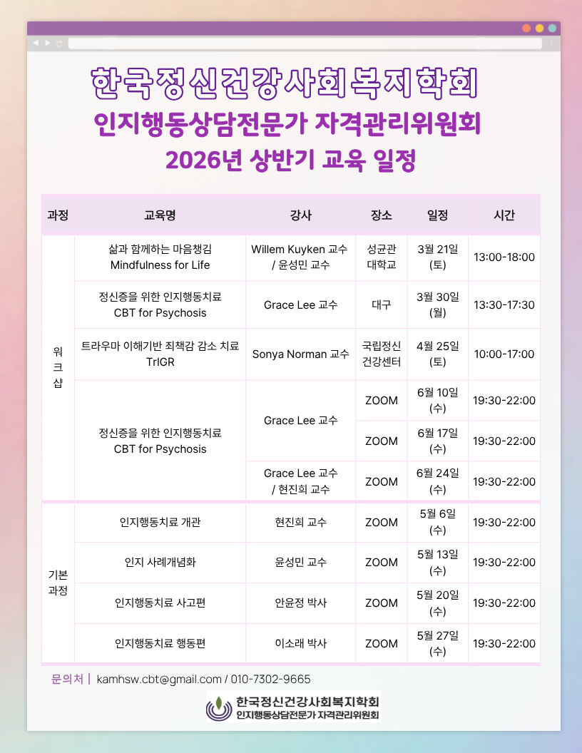 안녕하세요. 한국정신건강사회복지학회 인지행동상담전문가 자격관리위원회입니다.