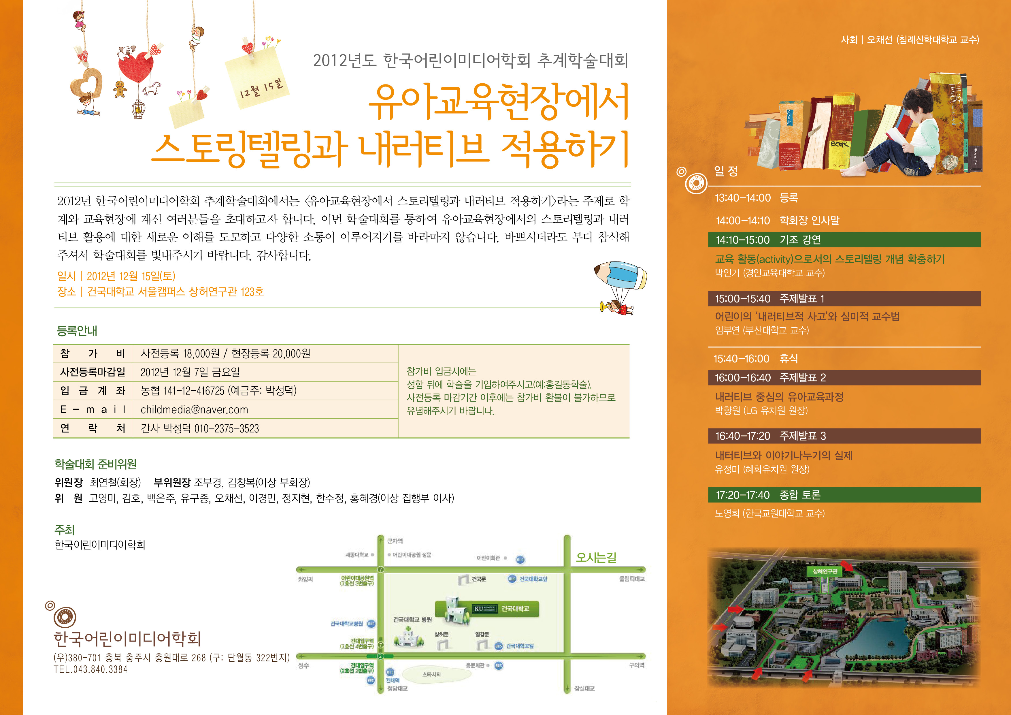 | <2012년 한국어린이미디어학회 추계 학술대회 안내> 안녕하십니까? 한국어린이미디어학회입니다. 2012년 12월 15일(토)에 개최되는 한국어린이미디어학회 2012년도 추계 학술대회를 안내드리고자 합니다. 2012년 한국어린이미디어학회 추계학술대회에서는 <유아교육현장에서 스토리텔링과 내러티브 적용하기>라는 주제로 학계와 교육현장에 계신 여러분들을 초대하고자 합니다. 이번 학술대회를 통하여 유아교육현장에서의 스토리텔링과 내러티브 활용에 대한 새로운 이해를 도모하고 다양한 소통이 이루어지기를 바라마지 않습니다. 바쁘시더라도 부디 참석해주셔서 학술대회를 빛내주시기 바랍니다. 감사합니다. ---------------------------------- 다 음 -------------------------------- * 장소 - 건국대학교 서울캠퍼스 상허연구관 123호 * 일시 - 2012년 12월 15일 (토), 13:40 ~ 17:40 * 일정 - 기조 강연: 교육 활동(activity)으로서의 스토리텔링 개념 확충하기 박인기(경인교육대학교 교수) 주제발표 1: 어린이의 '내러티브적 사고'와 심미적 교수법 임부연(부산대학교 교수) 주제발표 2: 내러티브 중심의 유아교육과정 박향원(LG 유치원 원장) 주제발표 3: 내러티브와 이야기나누기의 실제 유정미(혜화유치원 원장) 종합 토론 노영희(한국교원대학교 교수) * 등록안내 - 사전등록 : 18,000원 / 현장등록 20,000원 사전등록 마감일 : 2012년 12월 7일 금요일 입금계좌 : 농협 141-12-416725(예금주: 박성덕) 입금시 성명과 소속 기재 바랍니다 ex) 박성덕교원대 * 학술대회 내용 및 사전등록과 관련된 자세한 내용은 첨부되는 리플렛을 참조하시기 바랍니다. |