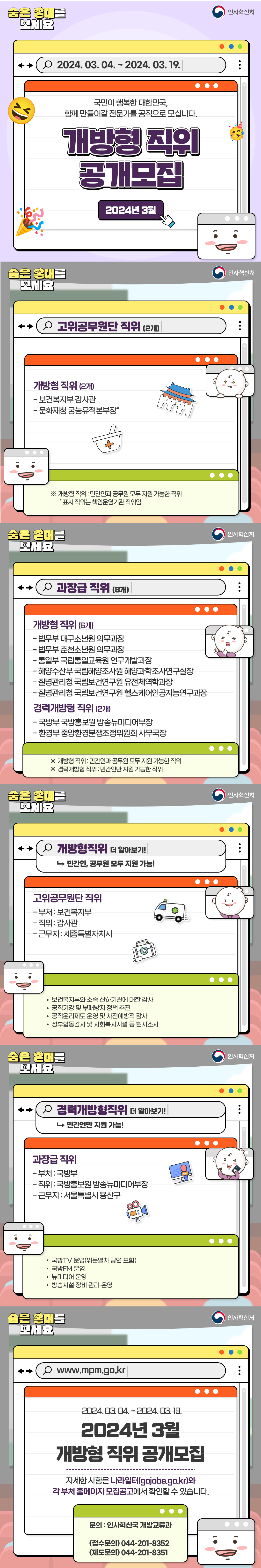 인사혁신처에서는 2024년 3월 고공단 및 과장급 개방형 10개 직위를 붙임과 같이 선발하고 있습니다.
