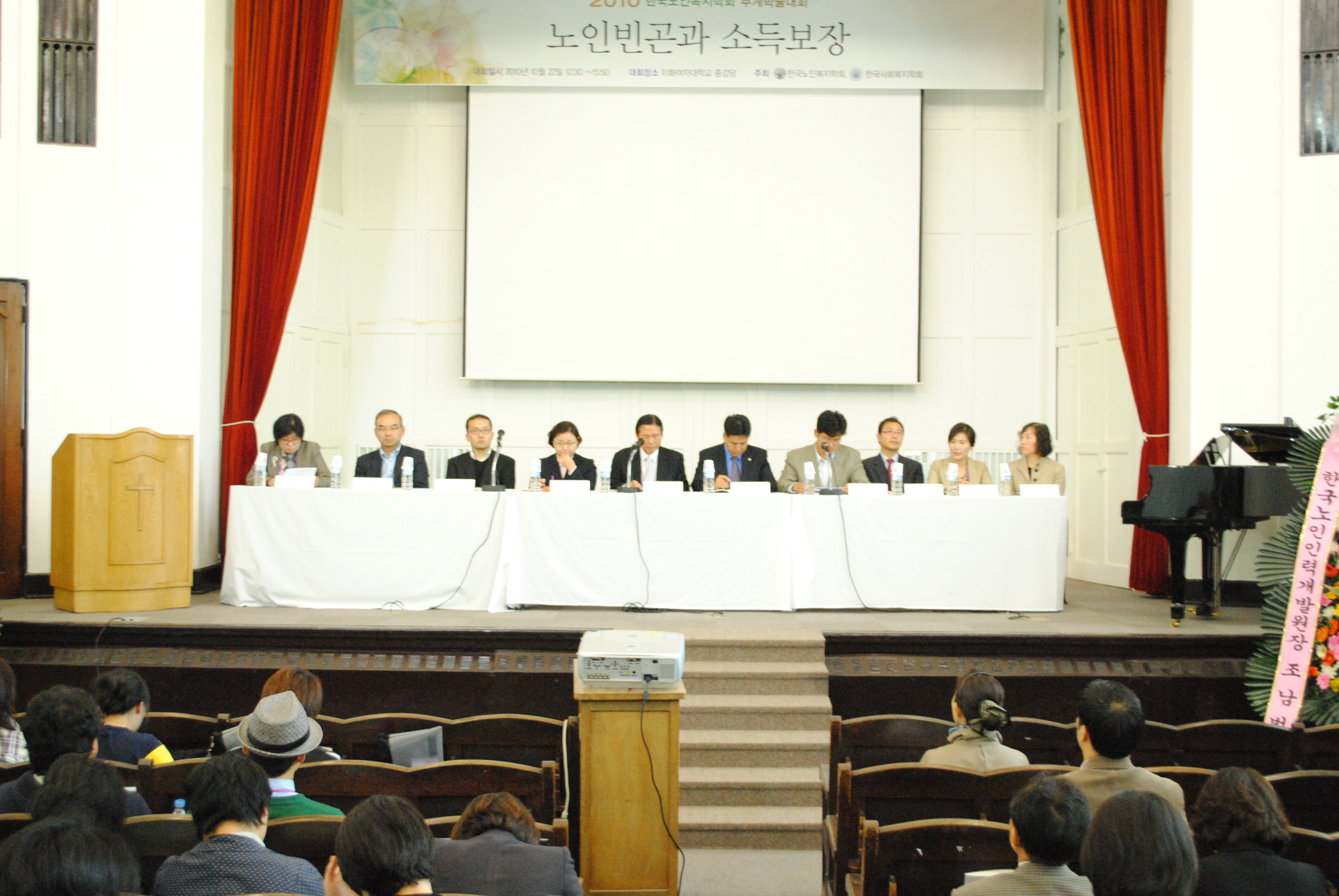 2010년 추계학술대회를 지난 10월 22일(금) 이화여자대학교에서 “노인빈곤과 소득보장” 이라는 주제로 300여명이 참석한 가운데 성공적으로 개최하였다. 한국 노인빈곤대책의 내실화를 위한 사회보장적 발전방안(류애정, 보건복지부), 일본의 노인빈곤과 소득보장(조추용, 꽃동네현도사회복지대학교), 영국의 베버리지언적 연금발전: 노인빈곤으로의 함의(최영준, 고려대학교)에 대한 훌륭한 발표가 있었으며 주제별로 토론이 진행되었다. 발표와 토론 과정에서 학문적으로나 정책적으로 크게 기여할 수 있는 내용들이 제시되었으며, 국가의 노인복지정책의 발전에 공헌할 수 있는 대책들이 논의되었다.