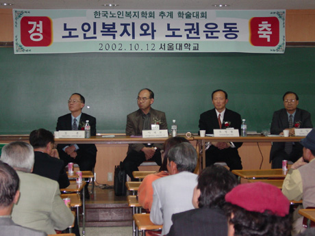 2002년 10월 12일(토) 서울대학교 사회동에서 학회 회원 및 주요인사 160여명이 참석한 가운데 <노인복지과 노권운동>이라는 대주제로 열린 2002년 추계학술대회에서 주제발표와 토론이 진행되고 있다./ 촬영자 : 옥재은