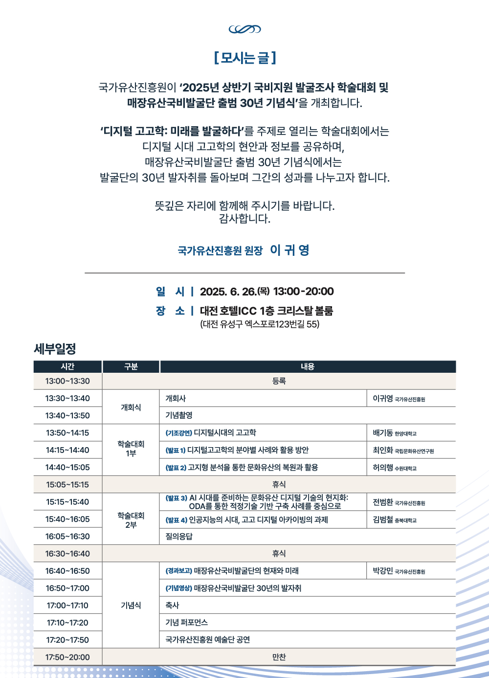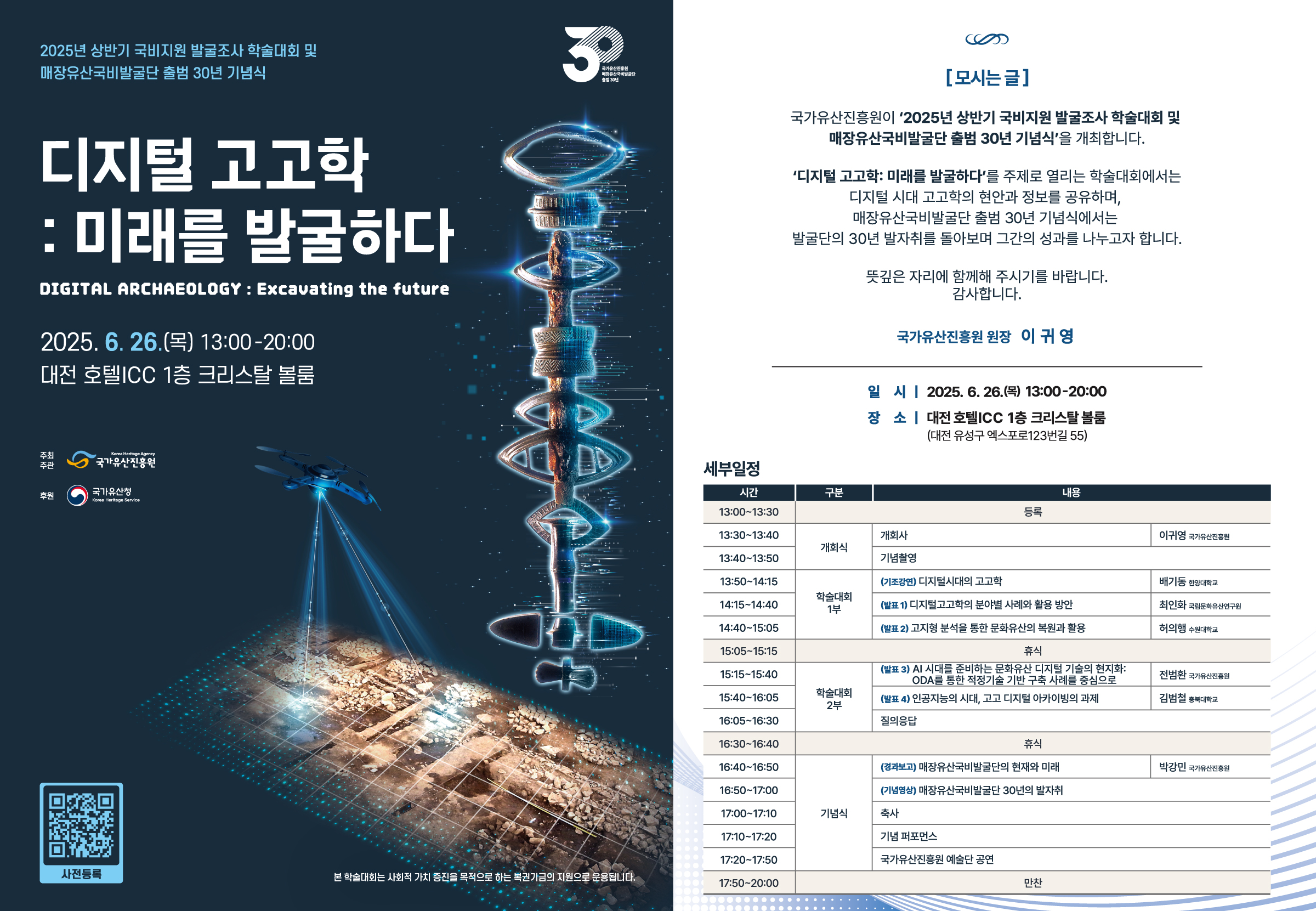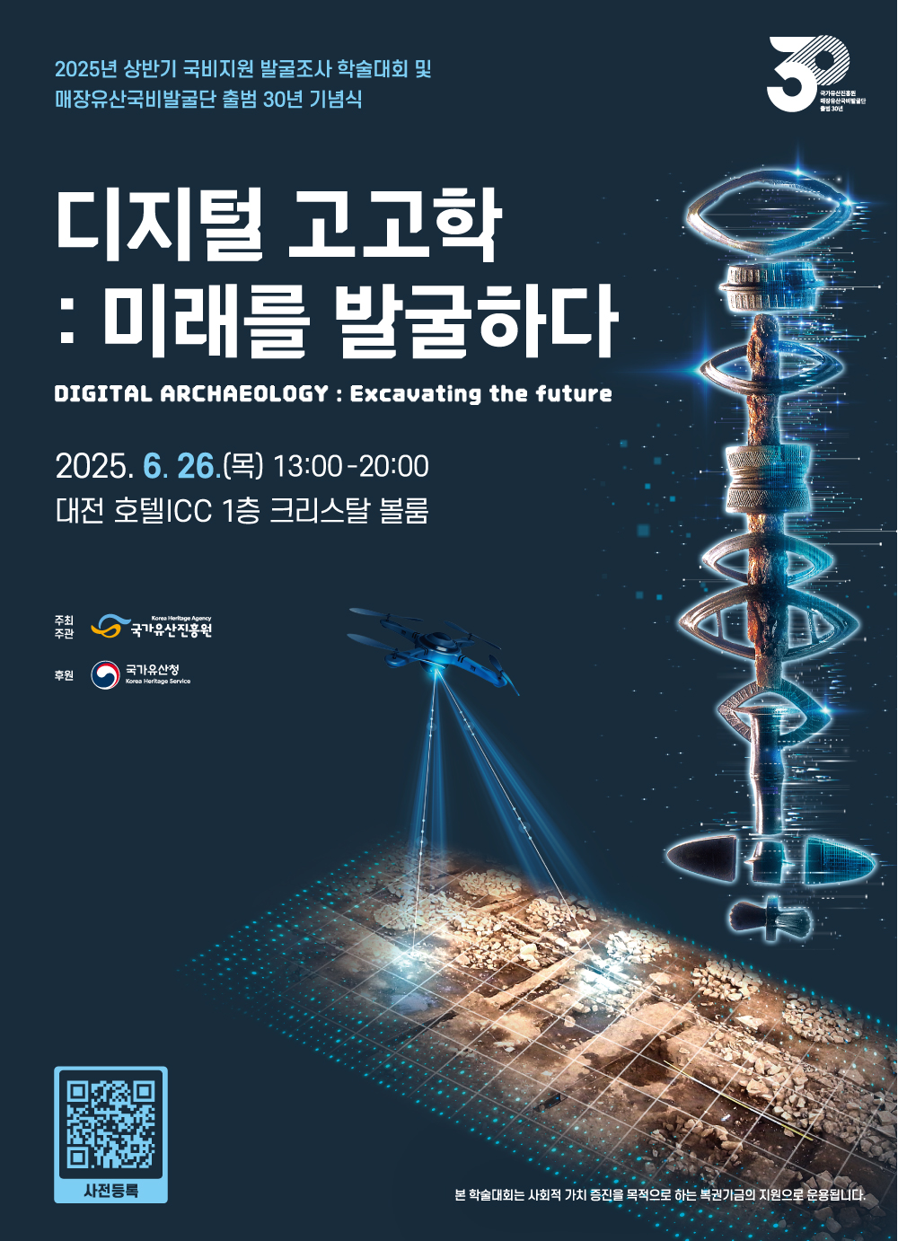 국가유산진흥원이 '2025년 상반기 국비지원 발굴조사 학술대회 및 매장유산국비발굴단 출범 30주년 기념식'을 개최합니다.