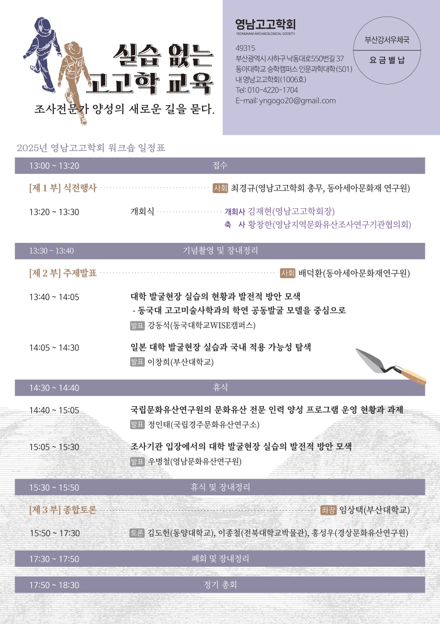 저희 학회에서는 올해를 마무리하며, 「실습 없는 고고학 교육: 조사전문가 양성의 새로운 길을 묻다.」라는 주제로 2025년 워크숍을 개최하고자 합니다.