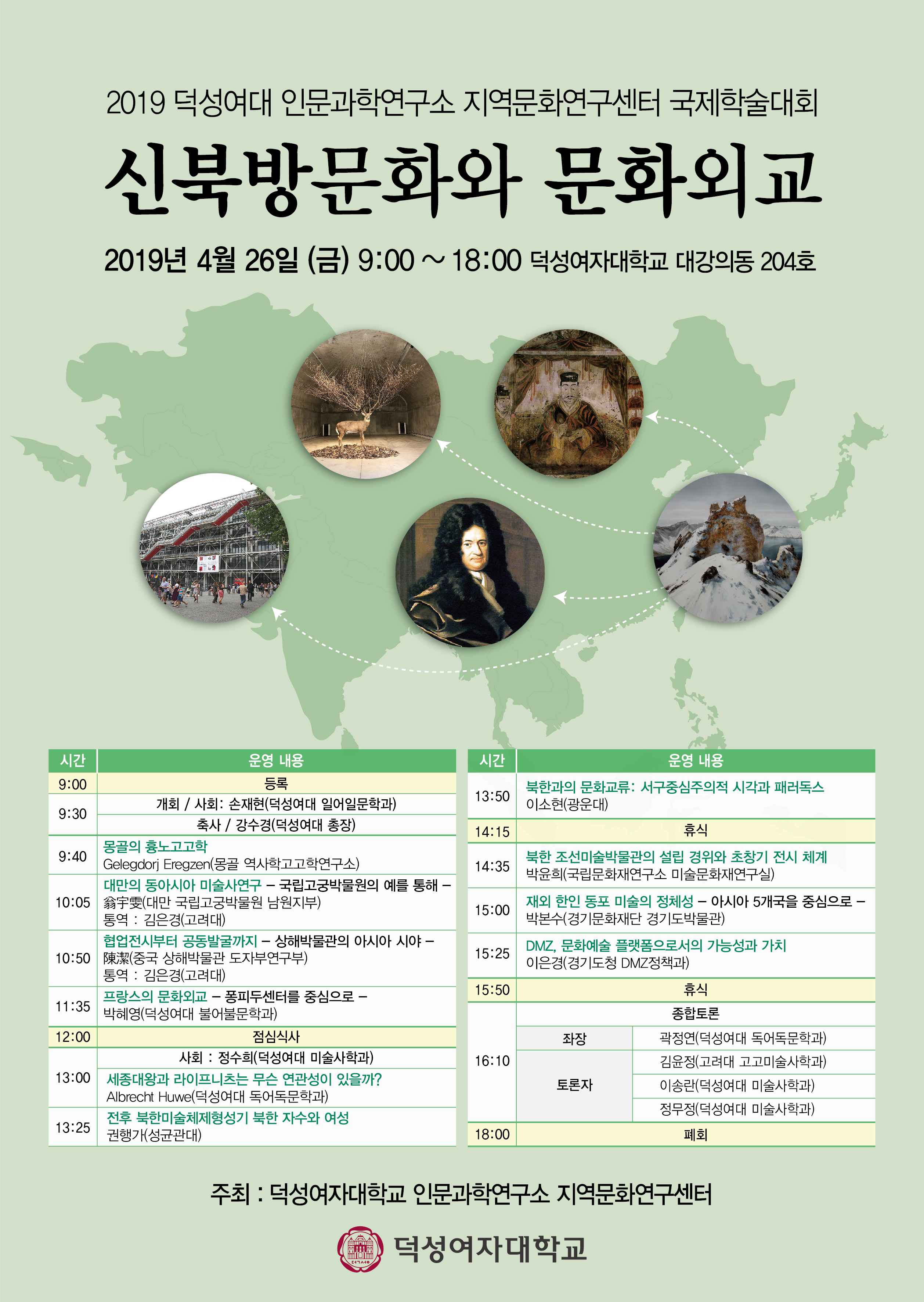 덕성여자대학교 인문과학연구소 지역문화연구센터에서는 2019년 춘계 국제학술대회에 여러분을 초대하고자 합니다. 이번 학술대회에서는 한국, 몽골, 독일, 중국, 대만 등 국내외 여러 학자들이 ‘신북방문화와 문화외교’라는 주제를 가지고 오늘날의 신북방문화가 갖는 의미와 그에 상응하는 문화외교의 방향에 대하여 발표와 토론을 진행할 예정입니다. 덕성여자대학교 인문과학연구소는 이번 학술대회를 계기로 남북 협력과 화해를 위한 연구와 교육에 지속적인 관심을 기울이고자 합니다. 바쁘시더라도 함께 하셔서 자리를 빛내주시기 바랍니다.