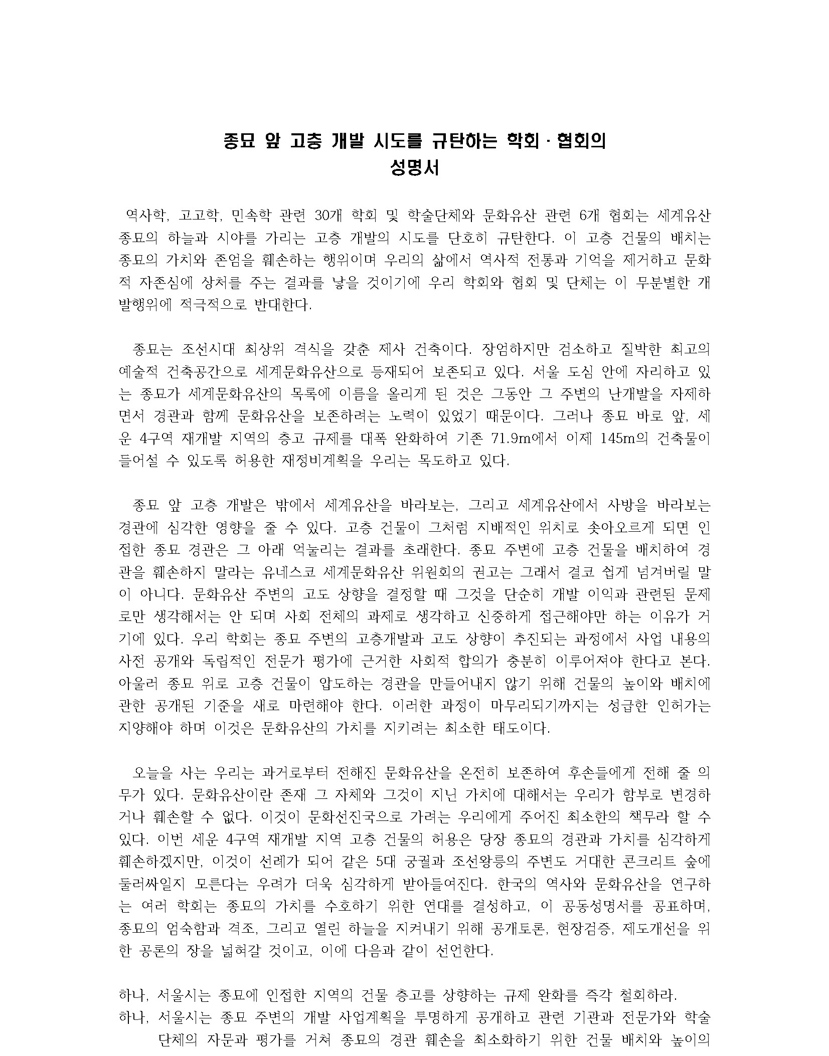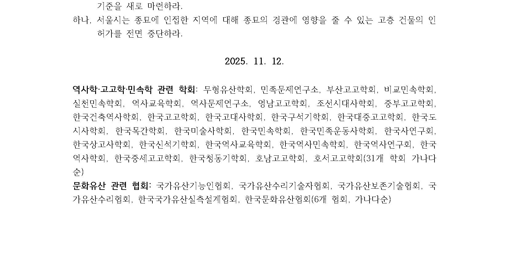 종묘 앞 고층 개발 시도를 규탄하는 학회·협회의 성명서