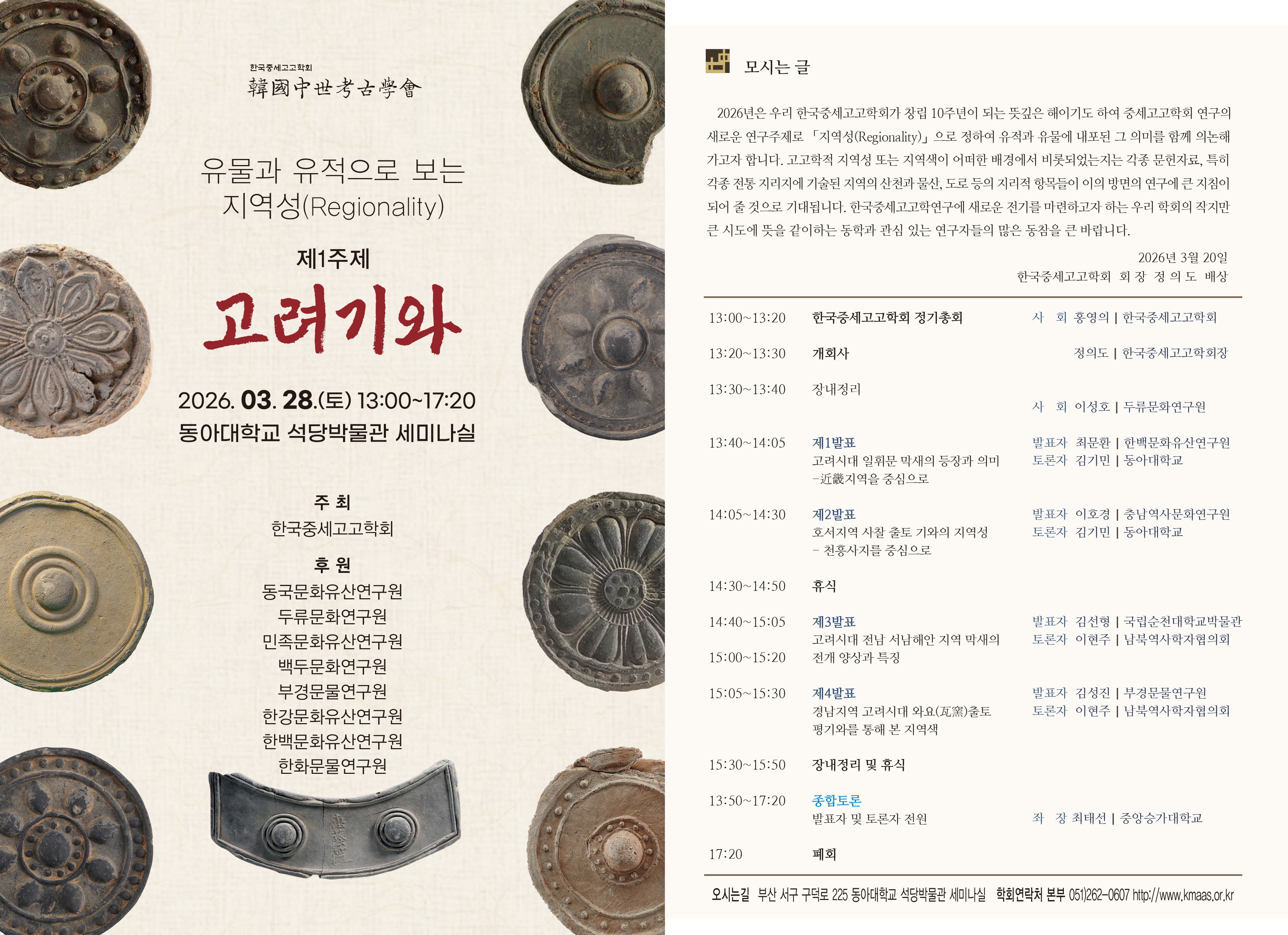 우리 한국중세고고학회에서는 2026년 춘계학술대회를 시작으로 「지역성(Regionality)」이라는 주제로 다양한 유물과 유적을 검토하고, 이를 통해 지역적 전통과 변화 배경에 대하여 살펴보고자 합니다. 우리 학회는 고고미술사 연구의 거대 주제인 「지역성」이라는 주제를 부각시킬 수 있는 유적과 유물을 선정하여 정기학술대회를 이어가고자 계획하고 있으며 그 첫 번째 기획으로 〈유물과 유적으로 보는 「지역성」 – 제1주제: 고려기와〉로 2026년 춘계학술대회를 개최합니다. 이번 학술대회에서는 지역성이라는 관점에서 고려시대 기와의 형식 변화와 제작 기법 및 사용 양상의 특징을 중심으로 지역적 차이를 탐색하고 그 차이가 내포하고 있는 의미를 고찰하는 자리가 될 것으로 기대됩니다.