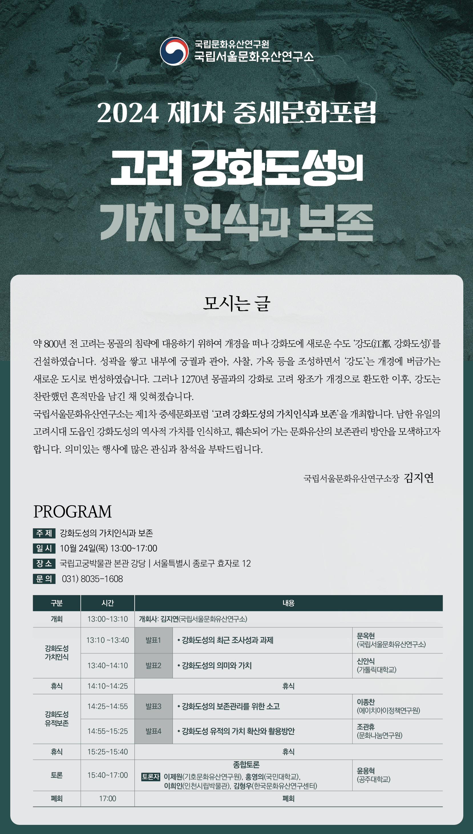 국립서울문화유산연구소에서 <고려 강화도성의 가치인식과 보존>을 주제로 2024년 제 1차 중세문화포럼을 개최합니다.